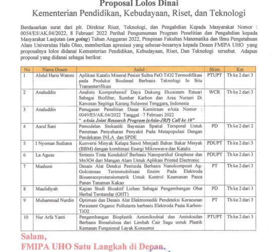 Pimpinan Fakultas Matematika dan Ilmu Pengatahuan Alam Universitas Halu Oleo memberikan apresiasi yang sebesar-besarnya kepada Dosen FMIPA UHO yang proposalnya lolos didanai...