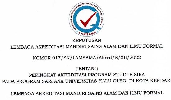 Berdasarkan Surat Keputusan Lembaga Akreditasi Mandiri Sains Alam dan Ilmu Formal (LAMSAMA) nomor: 017/SK/LAMSAMA/Akred/S/XII/2022 tanggal 13 Desember 2022, Program Studi Fisika, Fakultas...