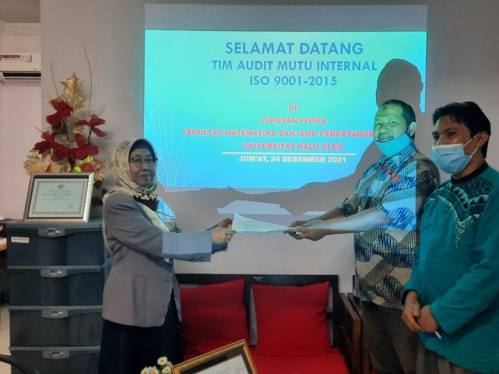 Jumat, 24 Desember 2021, Dalam rangka untuk menerapakan Sistem Manajemen Mutu sesuai standar ISO 9001:2015 FMIPA UHO melaksanakan Audit Internal Sistem Manajemen Mutu ISO 9001:2015 sebagai salah satu syarat untuk mendapatkan sertifikat Sistem Manajemen Mutu sesuai standar ISO 9001:2015 yang diikuti oleh unit terkait dalam lingkup FMIPA UHO.