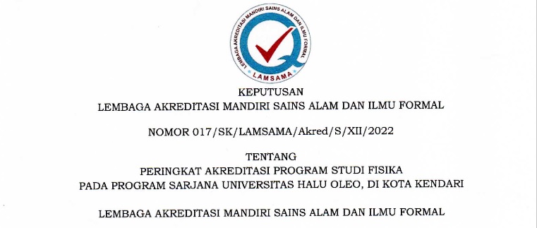 Berdasarkan Surat Keputusan Lembaga Akreditasi Mandiri Sains Alam dan Ilmu Formal (LAMSAMA) nomor: 017/SK/LAMSAMA/Akred/S/XII/2022 tanggal 13 Desember 2022, Program Studi Fisika, Fakultas Matematika dan Ilmu Pengetahuan Alam Universitas Halu Oleo mendapatkan peringkat akreditasi Unggul dengan nilai 361,39.  Hasil ini didapatkan setelah diadakan asesmen lapangan secara luring oleh tim asesor dari LAMSAMA pada tanggal 27 November...